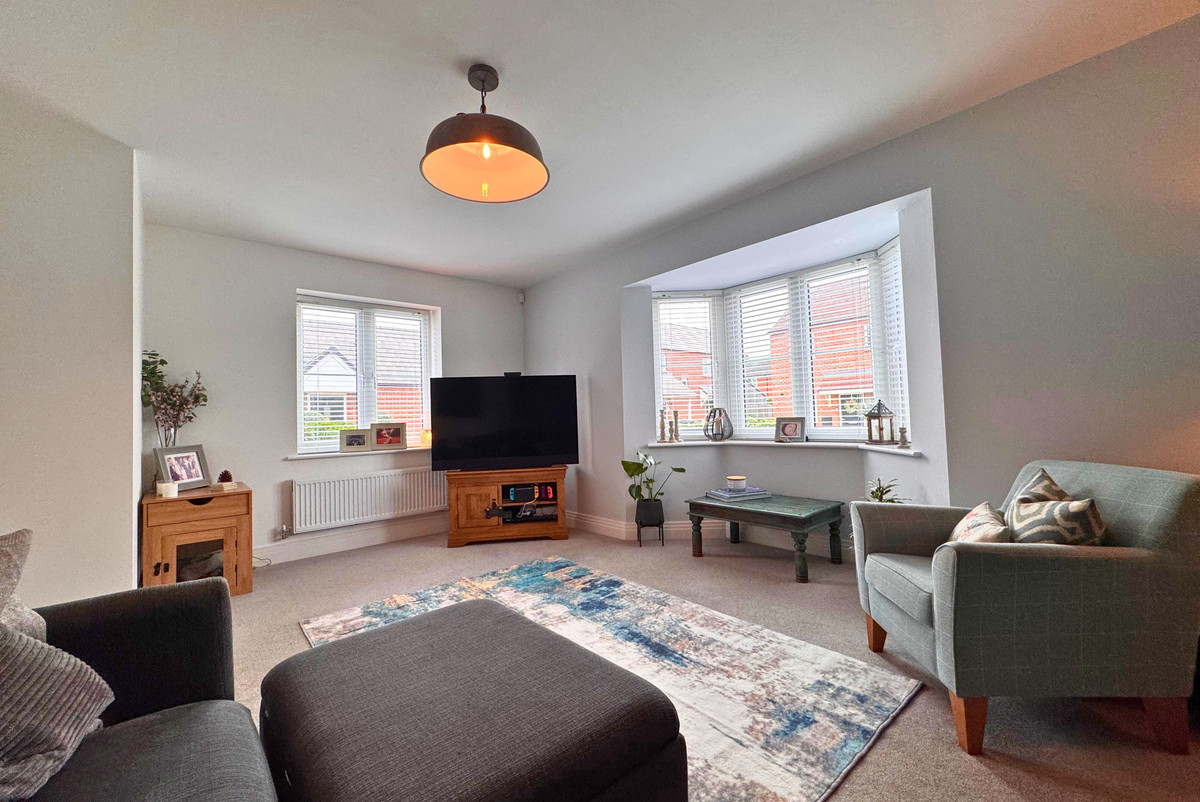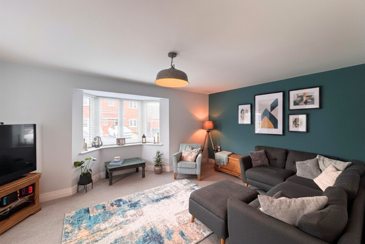 As you step into the hallway, you’re greeted by a fresh, modern feel that flows throughout the property. The spacious living room sits to your left, featuring a beautiful bay window that floods the space with natural light — the perfect spot for relaxing evenings or family time.
