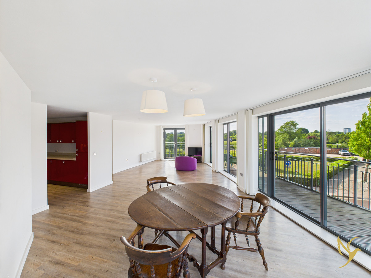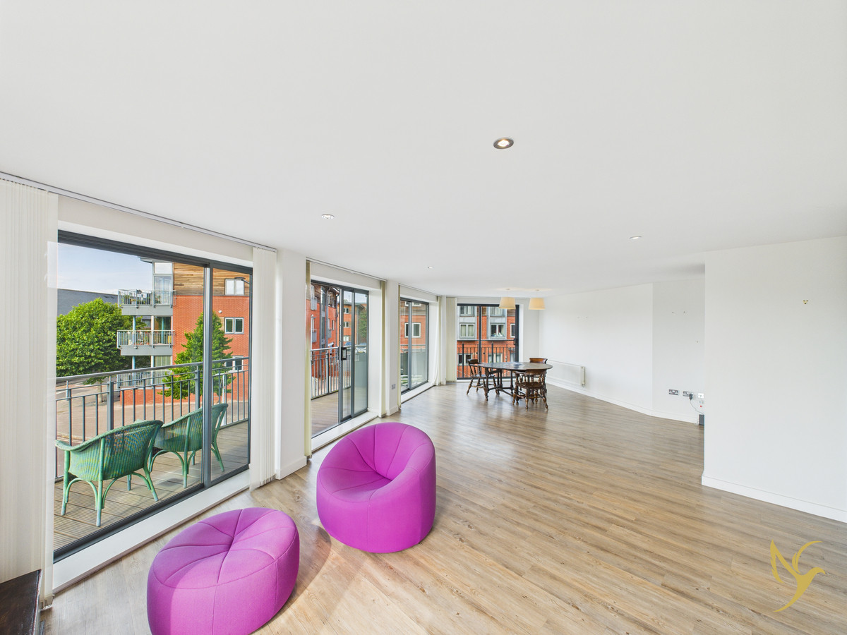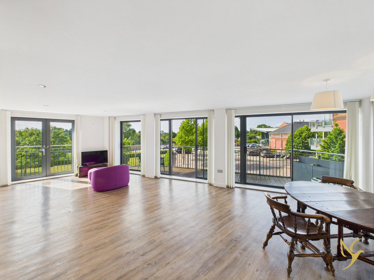 Generous open-plan lounge and dining area, perfect for entertaining, with floor‑to‑ceiling windows and doors leading to a wrap‑around balcony—ideal for morning coffee or evening socials with sweeping views across Diglis.
