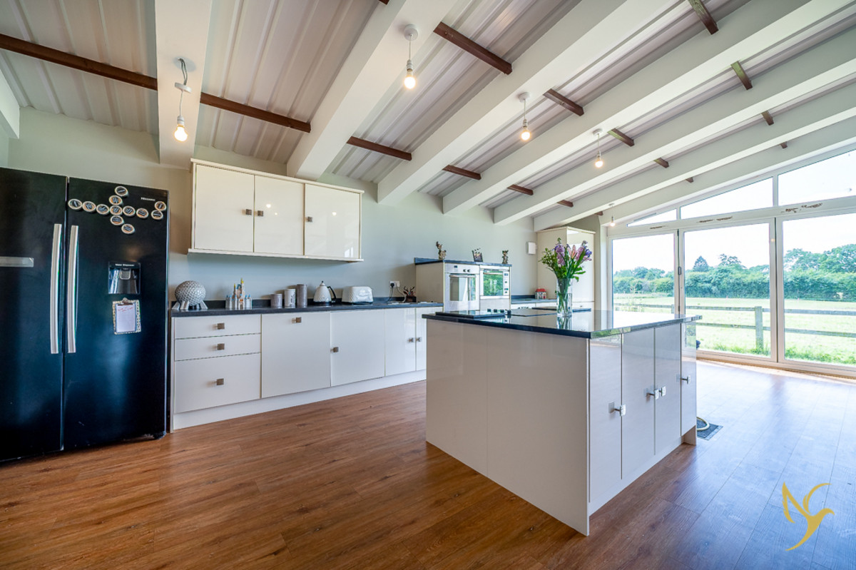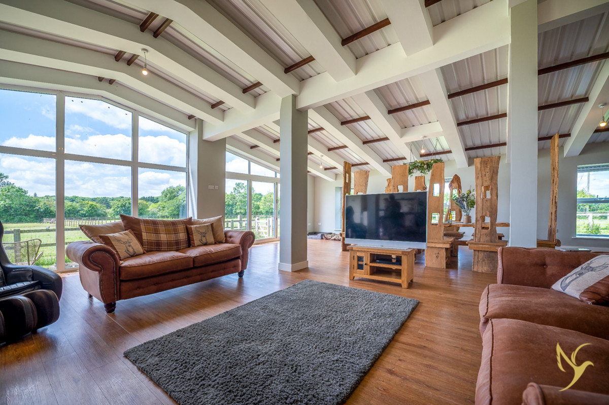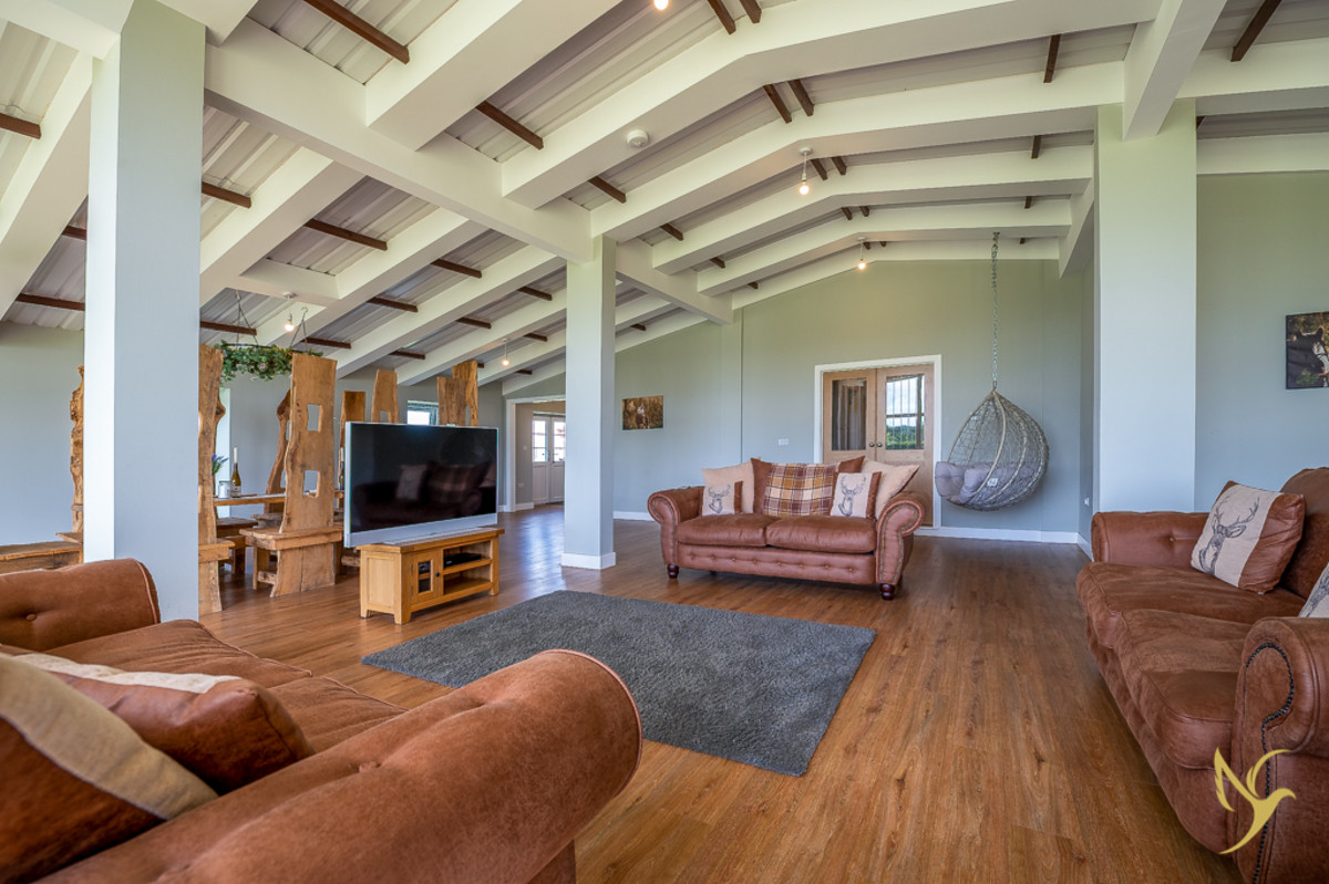 The modern barn-style design seamlessly blends modern aesthetics with rustic charm, creating a unique and inviting living space. The grand open-plan kitchen, living, and dining area is perfect for modern living, featuring high-end appliances and ample space for socialising, all while enjoying the stunning triple-aspect views over the property’s expansive grounds. Whether you are simply desire expansive outdoor space or an equestrian enthusiast, the property's versatile design caters to a range of lifestyles and interests.