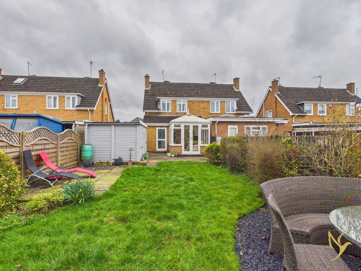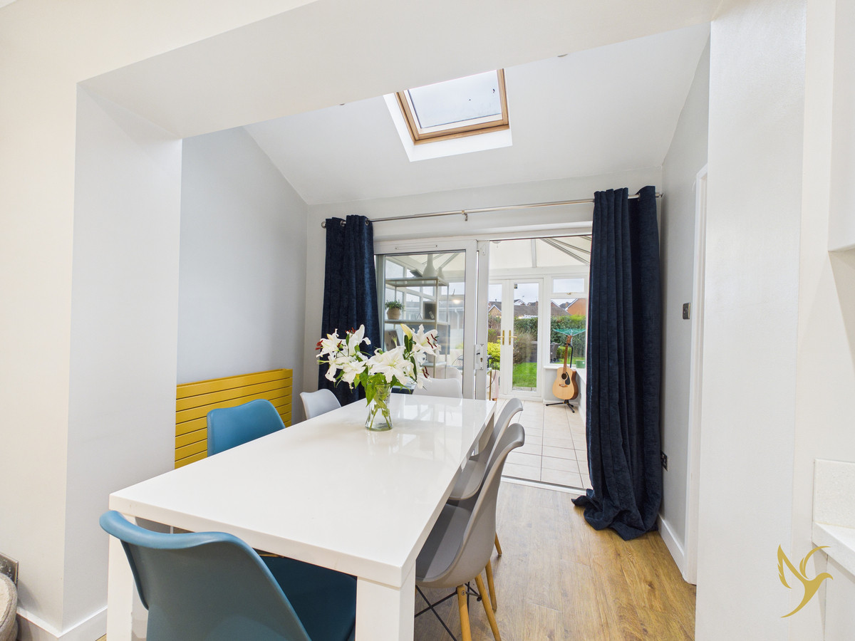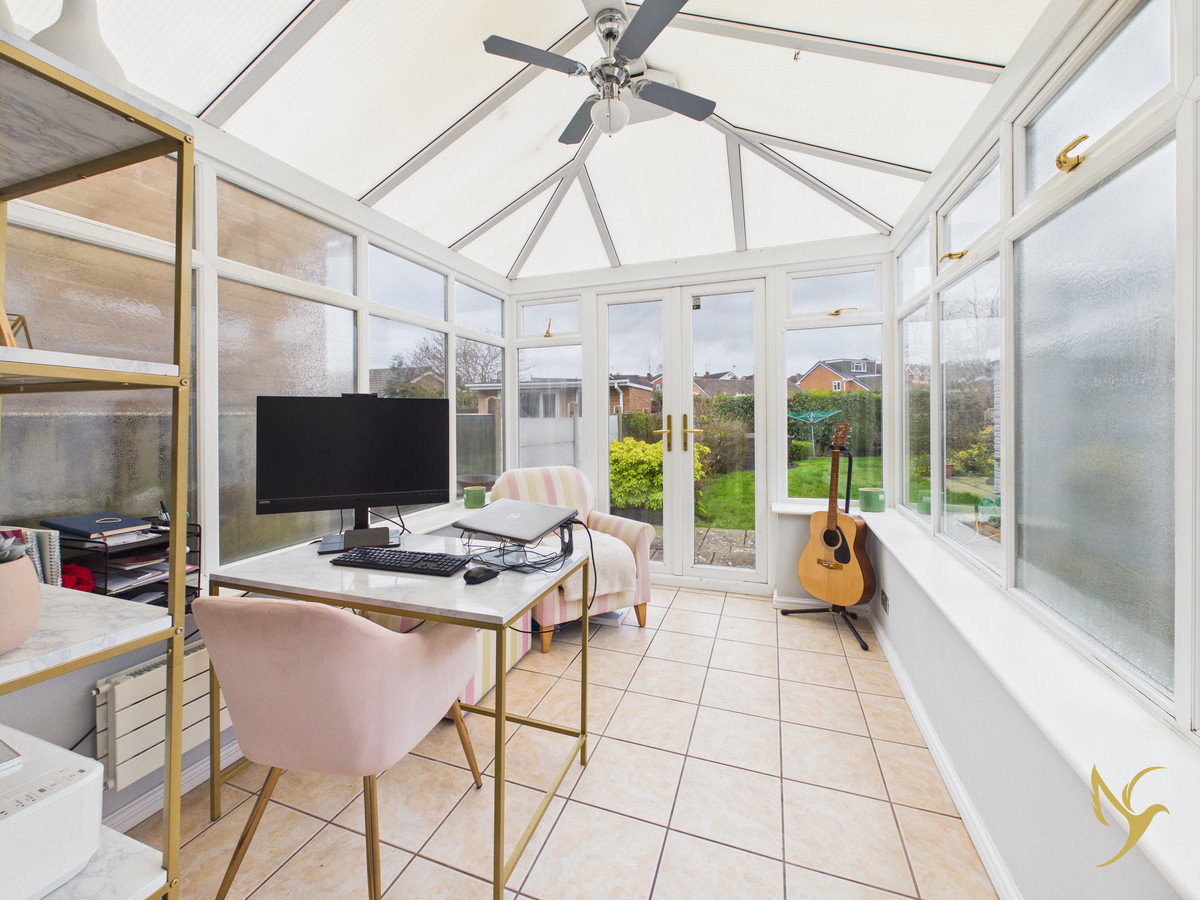 Just off the kitchen, a cosy conservatory offers additional reception space, with French doors opening out onto a generous L-shaped garden — ideal for relaxing or hosting family and friends during the warmer months.