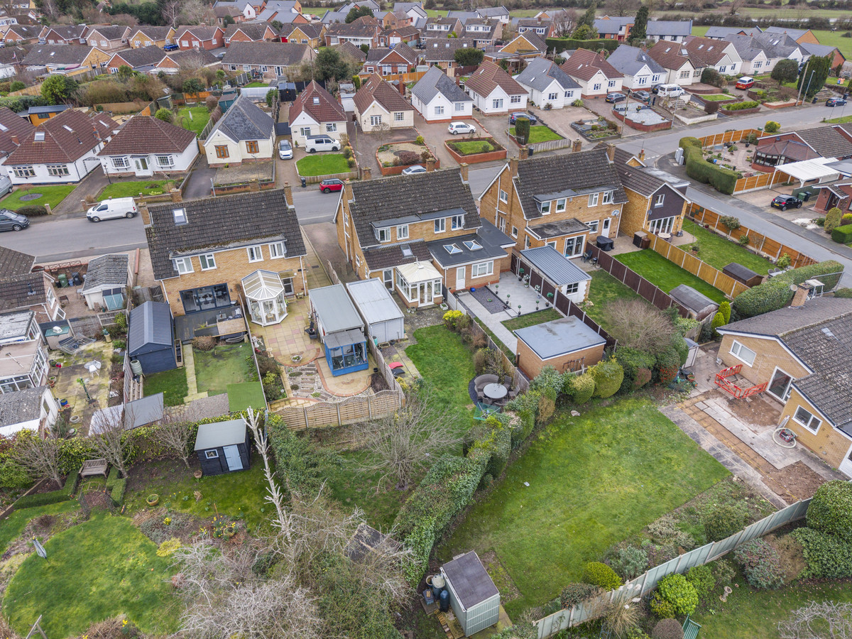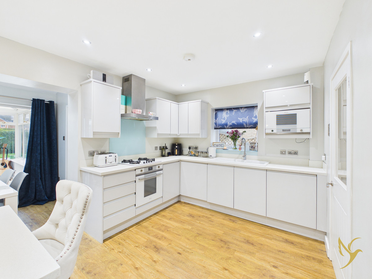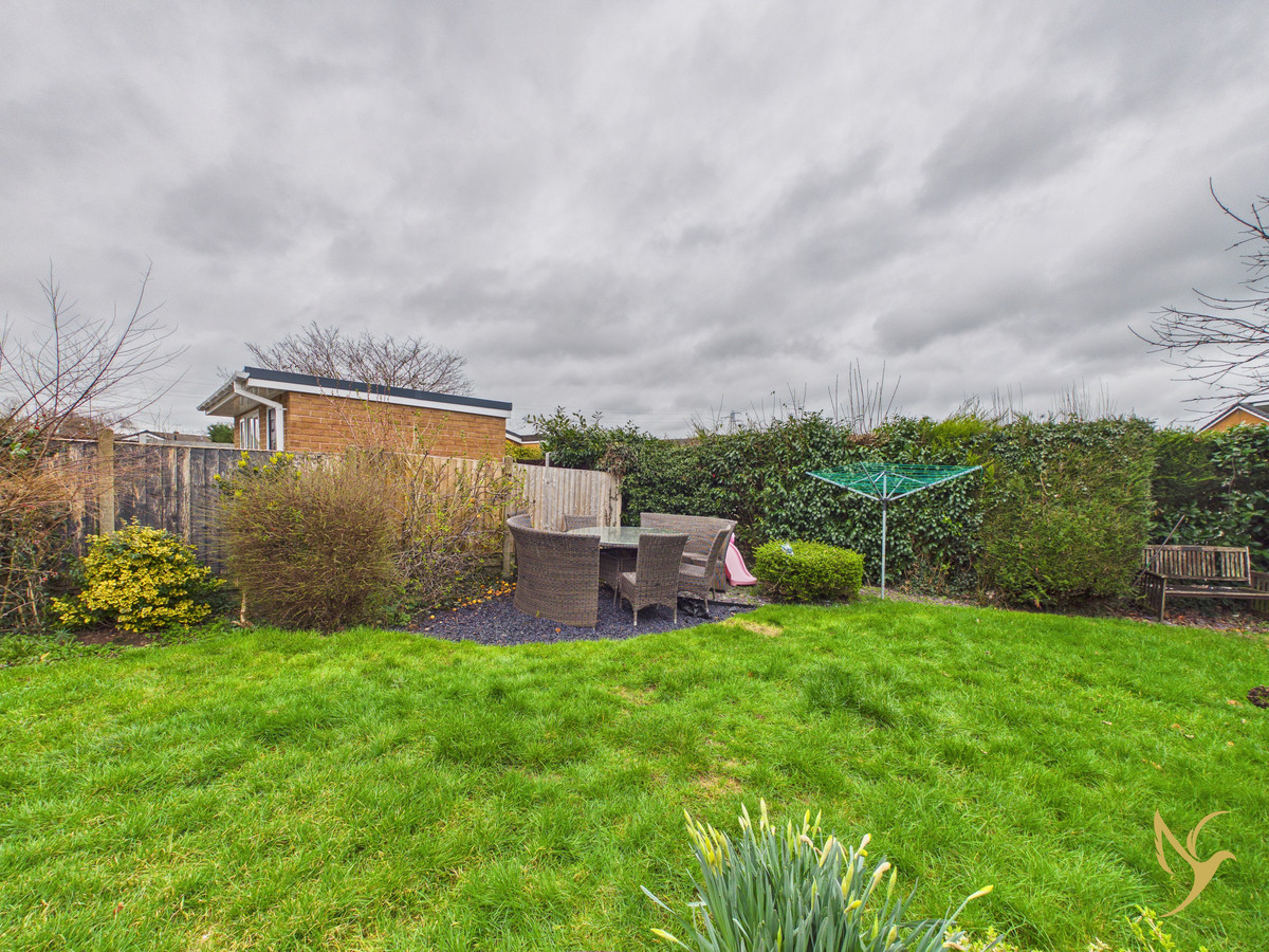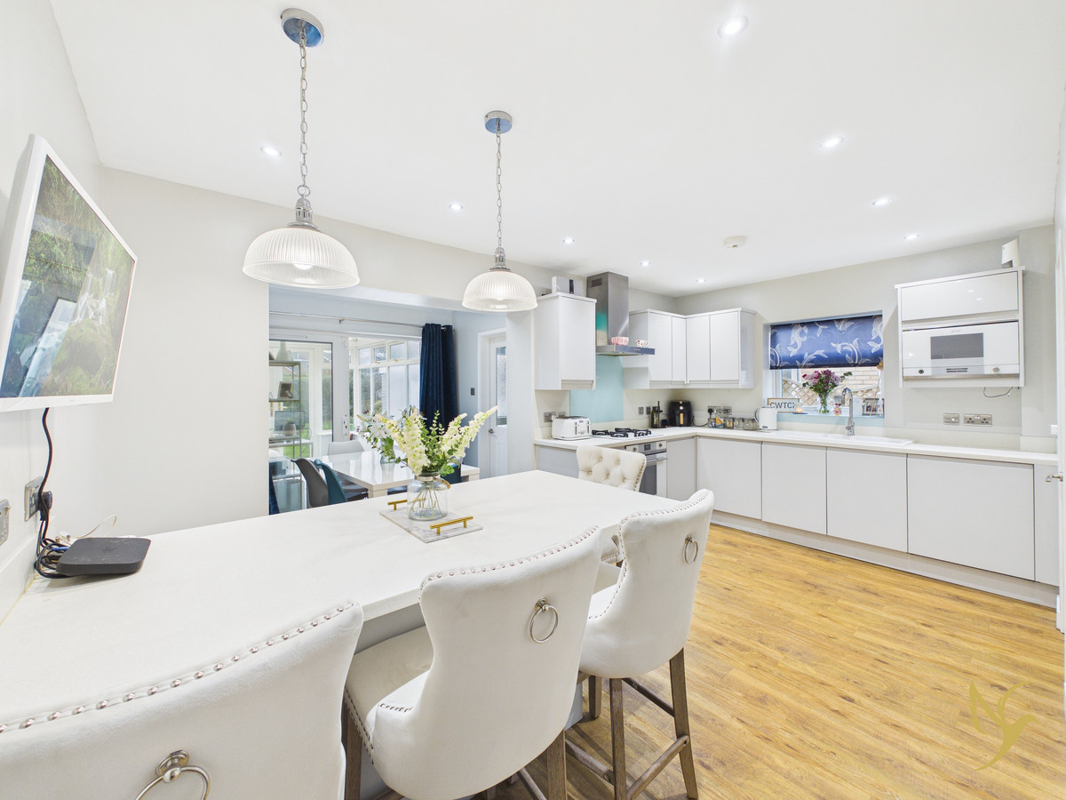 Just off the kitchen, a cosy conservatory offers additional reception space, with French doors opening out onto a generous L-shaped garden — ideal for relaxing or hosting family and friends during the warmer months.