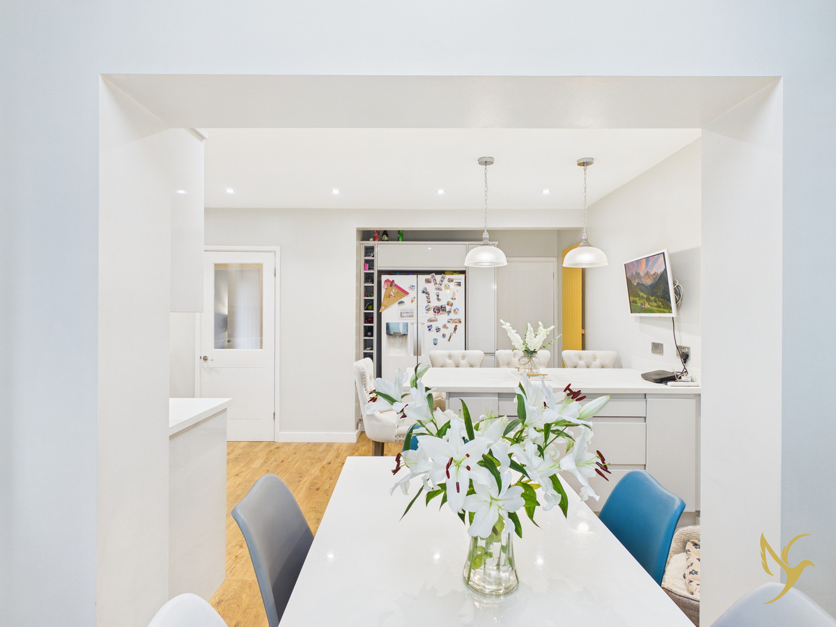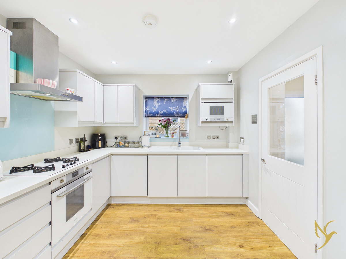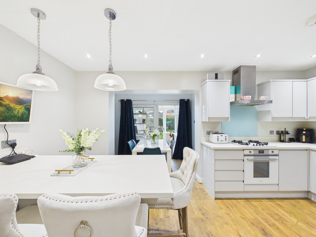 Upon entering, you are welcomed by a bright and inviting hallway, leading through to a stylish and comfortable kitchen. The kitchen is well-appointed with a generous range of wall and base units, complete with integrated cooker, hob, dishwasher, and microwave. A trendy breakfast bar and separate dining area provide excellent space for both everyday living and entertaining. There is also a large pantry cupboard.