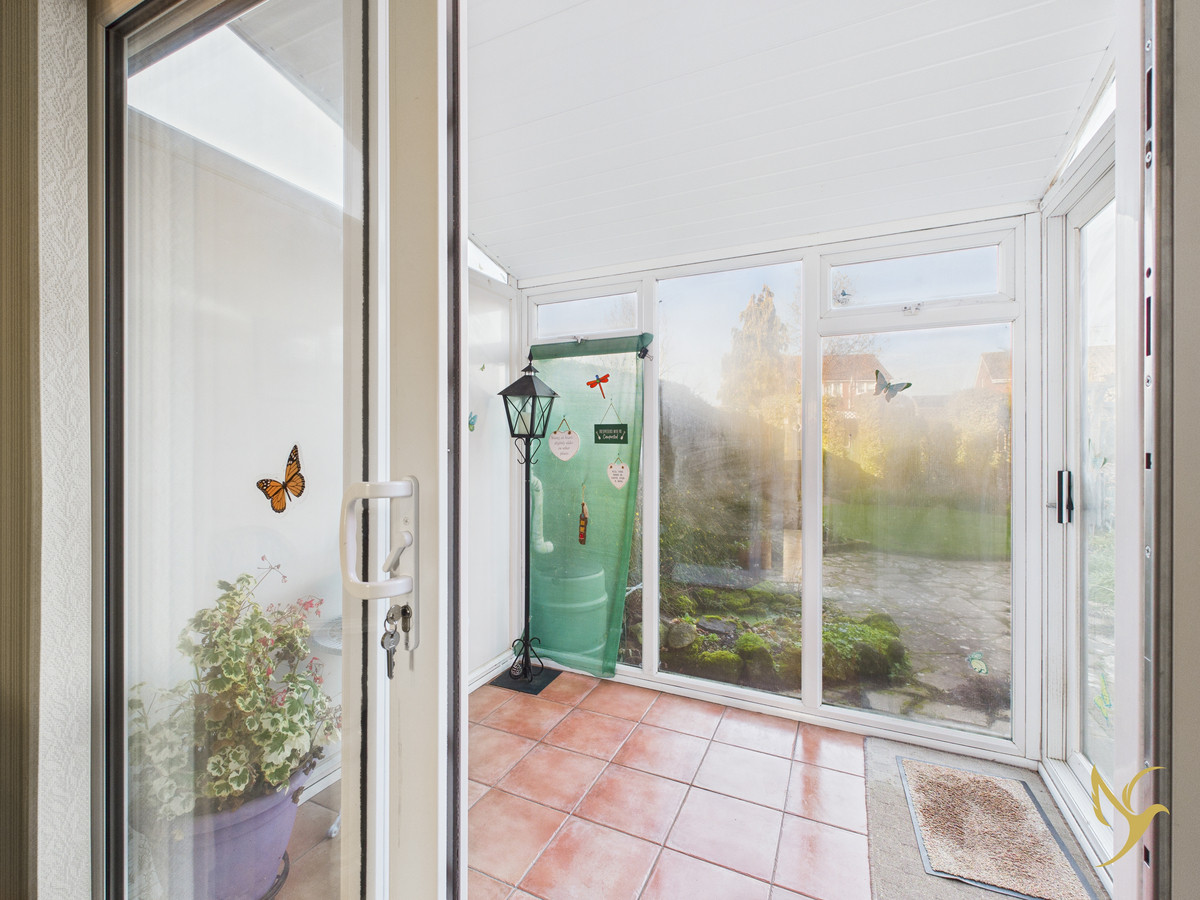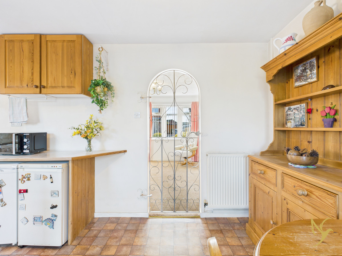 A charming internal gate leads through to the kitchen breakfast room, a great-sized kitchen diner with a lovely walk-in pantry-style feel, providing excellent storage and workspace. From the kitchen, doors open into a delightful sunroom (conservatory), which comfortably accommodates a table and chairs and enjoys peaceful views across the garden — an ideal spot for morning coffee or summer evenings.