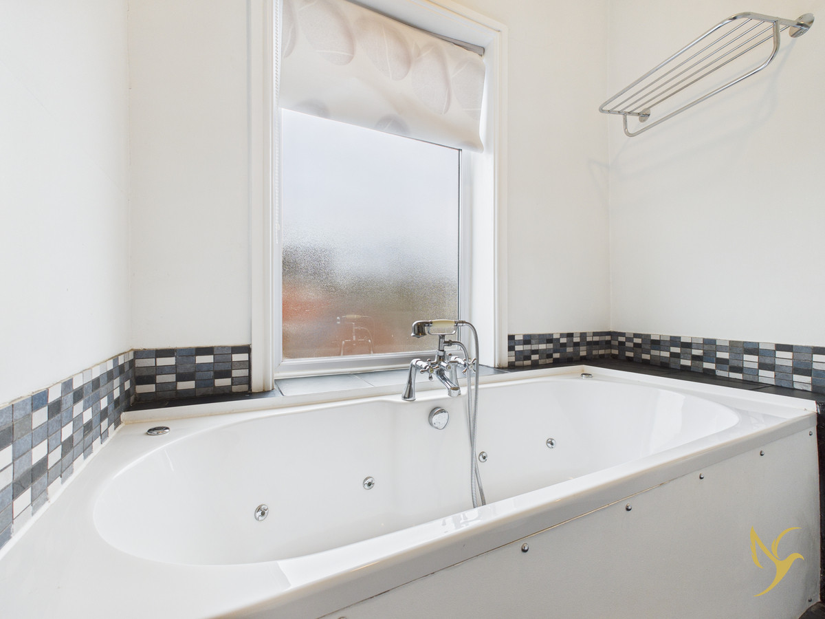 The crisply decorated family bathroom includes a jacuzzi style bath, WC, hand basin and airing cupboard.
